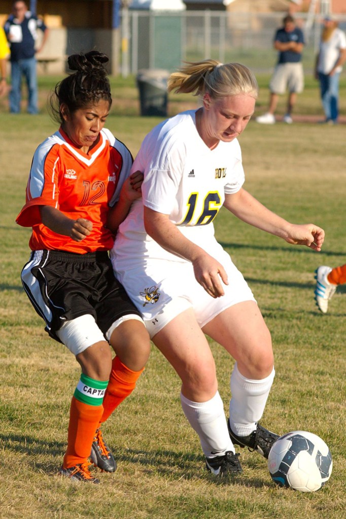 Megan Moralez heads the ball over a Bridgeport defender, but can’t quite get it past Fillie goalkeeper Ericelda Dominguez in the second half of last Thursday’s contest. Brent Baker / staff photo.