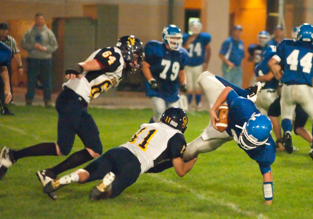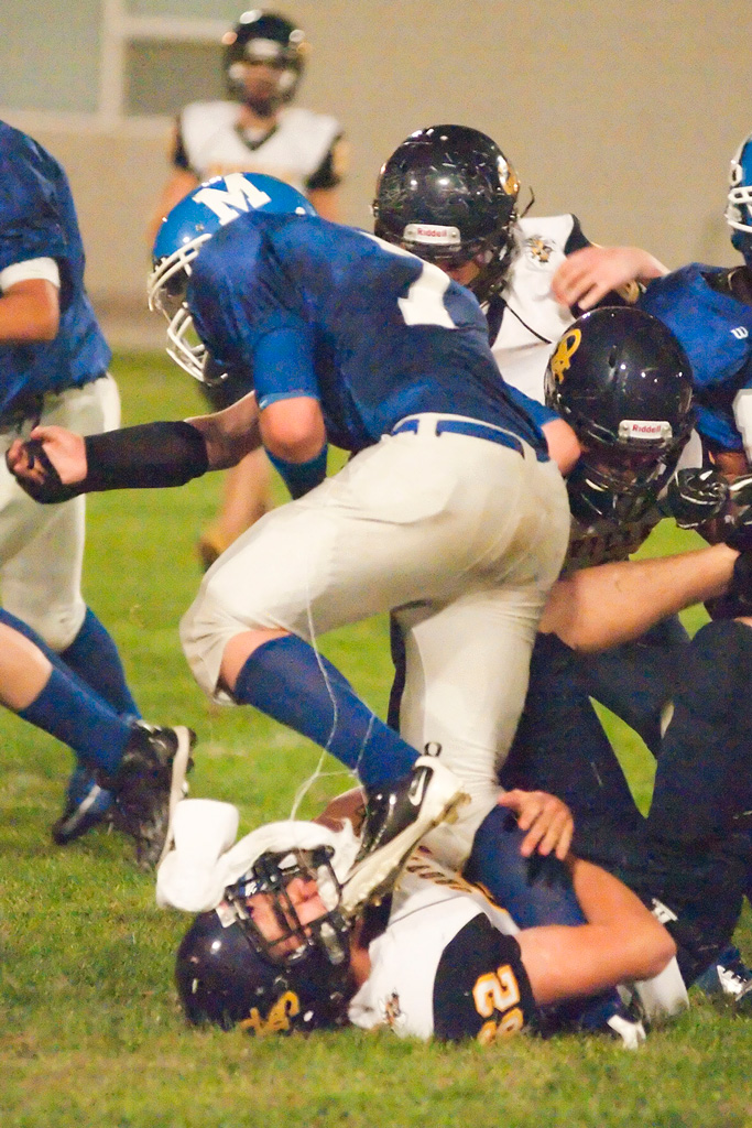 - Brent Baker/staff photo Mick Fulmer (62) gets a face full of cleat as he holds onto Manson quarterback Kent Ustanik.
