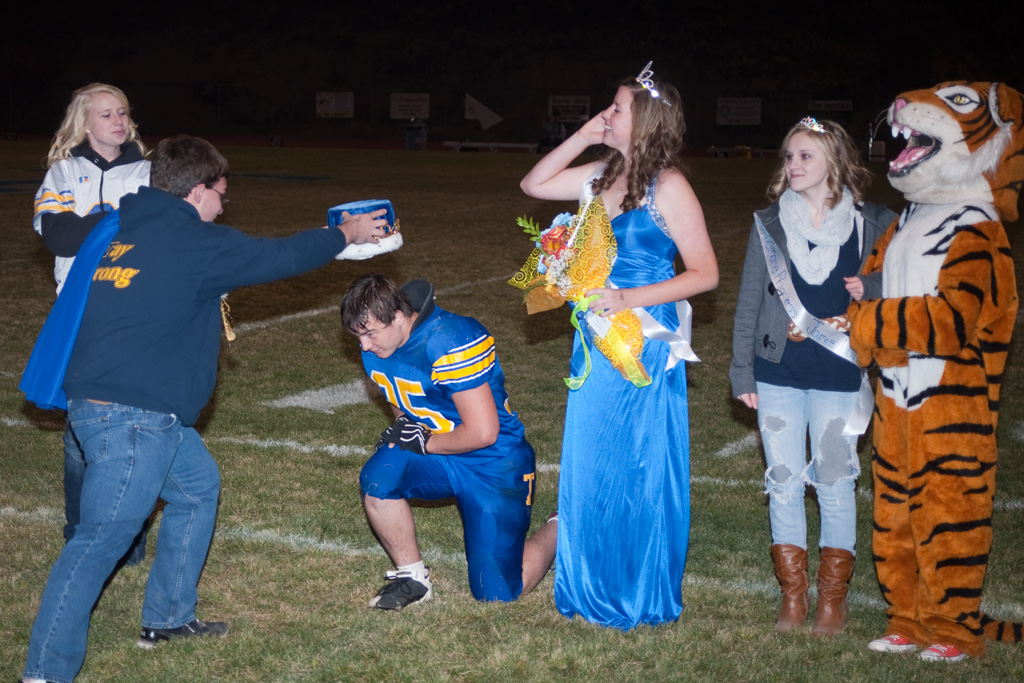 - Brent Baker/staff photo Austin Booker is crowned Mr. T. by last year’s winner, Dakota Bogart, as homecoming queen Megan Beyers looks on.