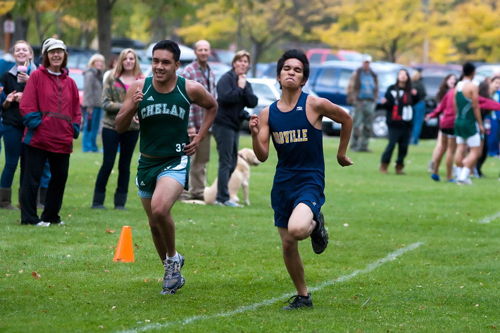 - Brent Baker/staff photo Oroville’s Ronel Kee and Chelan’s Junior Gonzalez sprint for the finish line at the Hornets’ invitational on Saturday.