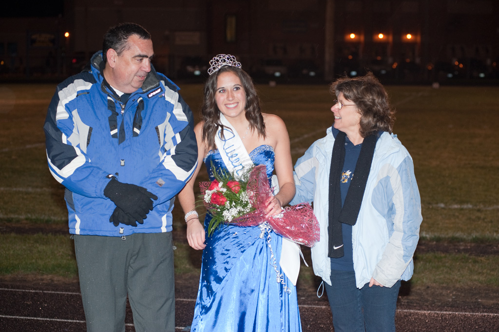 - Brent Baker/staff photo Oroville High School homecoming queen Becky Arrigoni shows off her crown in the rain at halftime of Friday’s game.
