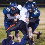 Angel Camacho (32) and Mick Fulmer (62) gang up on Bridgeport’s Tanner Varrelman.