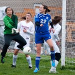 Tonasket’s Kylie Dellinger’s header off a corner kick is deflected by Okanogan goalkeeper Cameron Moses, who barely kept the Tigers from scoring what would have been a game-tying goal. Okanogan held on to beat Tonasket 1-0 in last Tuesday’s district playoff to end the Tigers’ season.