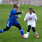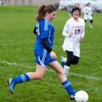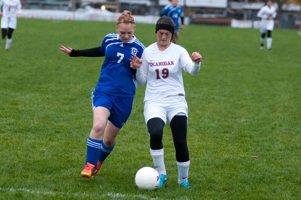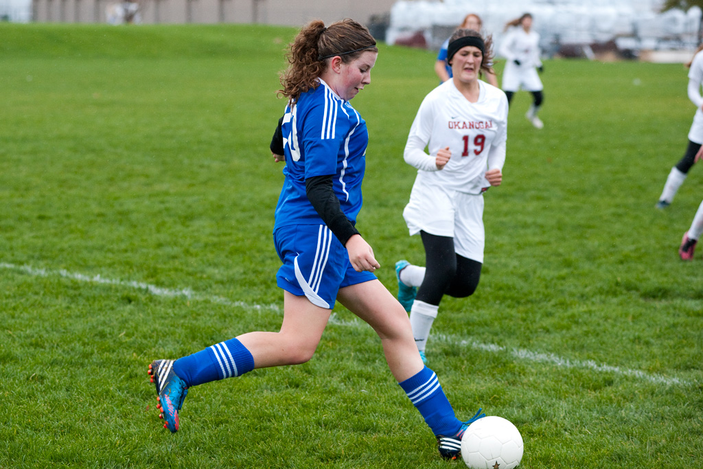- Brent Baker/staff photo Megan Beyers boots the ball upfield as Okanogan’s Kailey Huner moves in to defend.