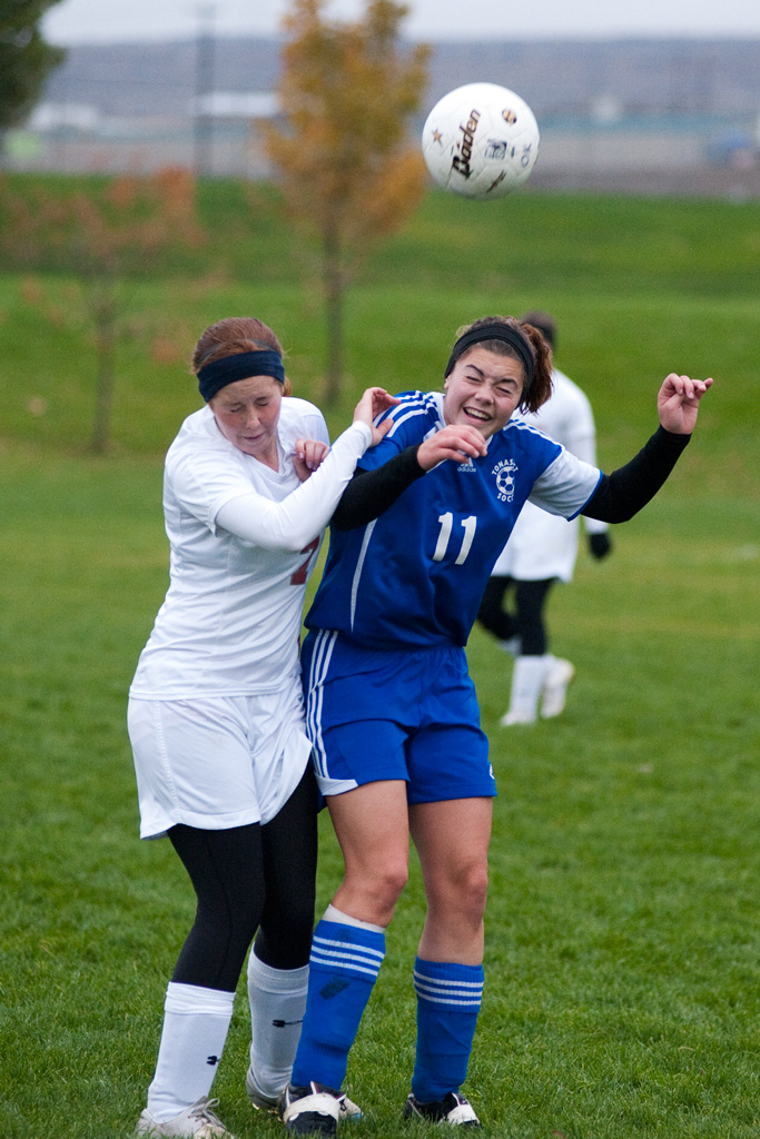 - Brent Baker/staff photo Tonasket’s Alicia Edwards heads off an Okanogan pass during Tuesday’s 1-0 playoff loss to the Bulldogs.