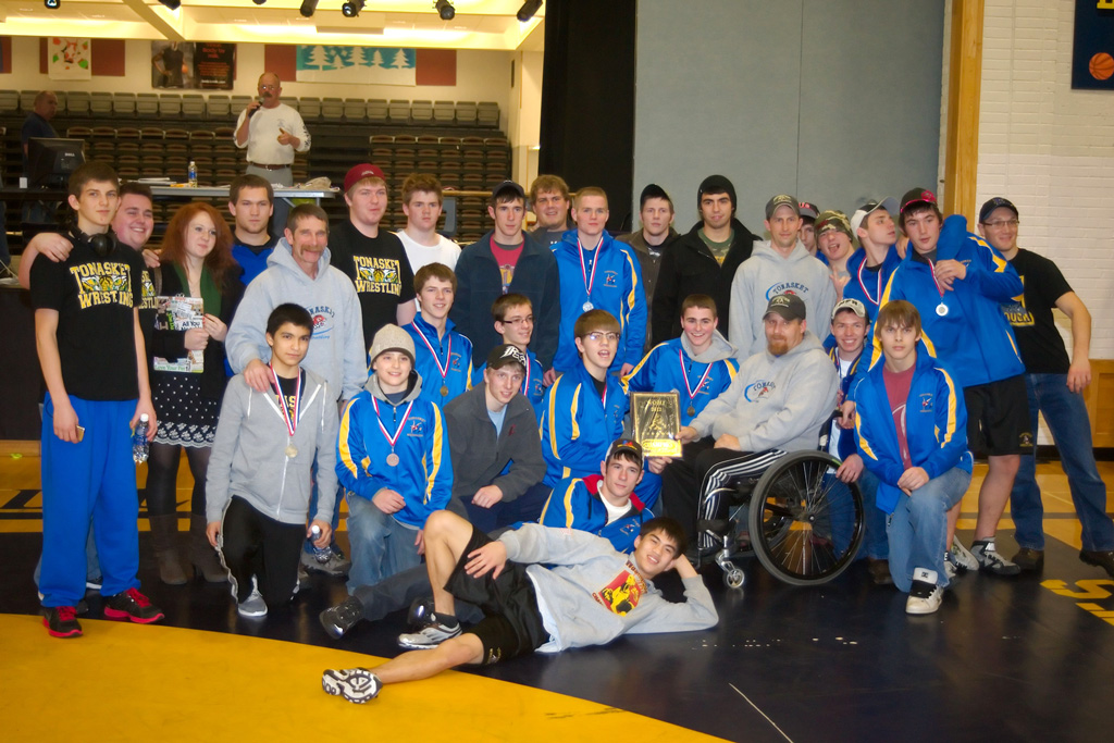 Tonasket’s wrestling team celebrates with its NOHI championship trophy on Saturday, Dec. 22. Scroll past results to see a slideshow with more photos from the meet.