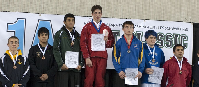 Jeff Stedtfeld (126) took fourth place, matching his brother Jared’s senior season finish from a year ago. Stedtfeld started the day with a loss in the state semifinal to Josh Crager of Cascade Christian, beat teammate Jorge Juarez 10-3 to reach the third place match, then lost a hearbreaker, 3-2, to Klint Brown of Lakeside.