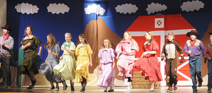 Missoula Children’s Theatre presented Beauty Lou and the Country Beast, an original country western adaptation of the classic fairy tale Beauty and the Beast on Saturday, March 1 at the THS Commons. Beauty Lou is the oldest daughter of the bronc-bustin’ balladeer Buck. At the local county fair, young Beauty Lou is upset by the ungrateful behavior of a miner who has won the blue ribbon for his beautiful roses. She calls him a beast and wishes that he would look like one too. Years later, when in danger of losing the family farm, Buck meets the miner-turned-beast. Beauty Lou agrees to befriend the Beast in order to save her family. Beauty Lou and the Beast both learn to look beyond appearances and first impressions and to see the beauty that dwells inside. The story, set in the American West, also features Beauty Lou’s six sisters, her Imaginary Friend, her dog Fleabite Clyde, farmhands Slim and Dusty, the neighborly Country Folk and the Barnyard Critters.