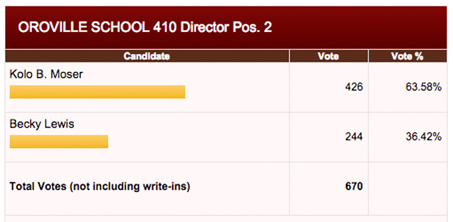 Kolo Moser, Agent in Charge of the Oroville Station of the U.S. Border Patrol, is ahead in the race against Becky Lewis, president of the Oroville Co-op Preschool. Moser has 426 votes (63.58 percent) to Lewis’ 244 (36.42 percent) for Director Position 2. The winner will take the seat being vacated by Amy Wise, a long time member of the school board.