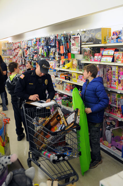 Law enforcement, Explorers and Principal Mikelson, with two or three kids each, picked out some winter clothing for each child, whether it be winter coats, boots, shoes, socks, pants or shirts. Each child had a certain budget that could be used to make the purchase and Country Store employees were on hand to help with sizes and answer questions. In addition, each child had a certain amount of money to spend on some toys.