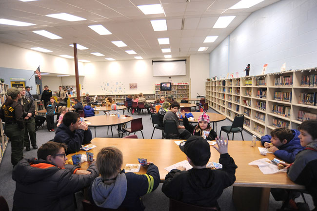 The day began at 8:30 a.m. with Oroville students joined by kids from Tonasket who arrived by bus in the Oroville Elementary Library. The Oroville Chapter of the Royal Neighbors provided juice and mini muffins and the kids sat down to watch the movie Polar Express. Following the movie everyone moved to the gym where kids, law enforcement, Mikelson and Explorers had several rousing games of dodgeball.